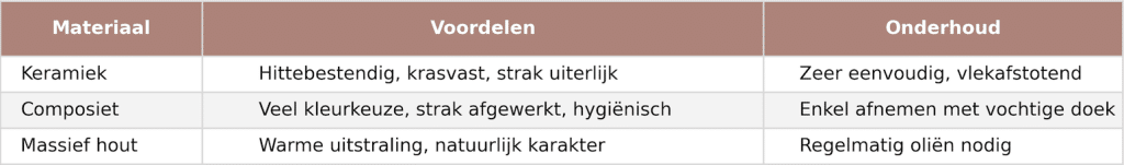Keramiek en composiet zijn het meest onderhoudsvriendelijk. Ze zijn hittebestendig, krasvast en eenvoudig te reinigen met een vochtige doek.