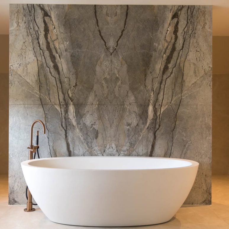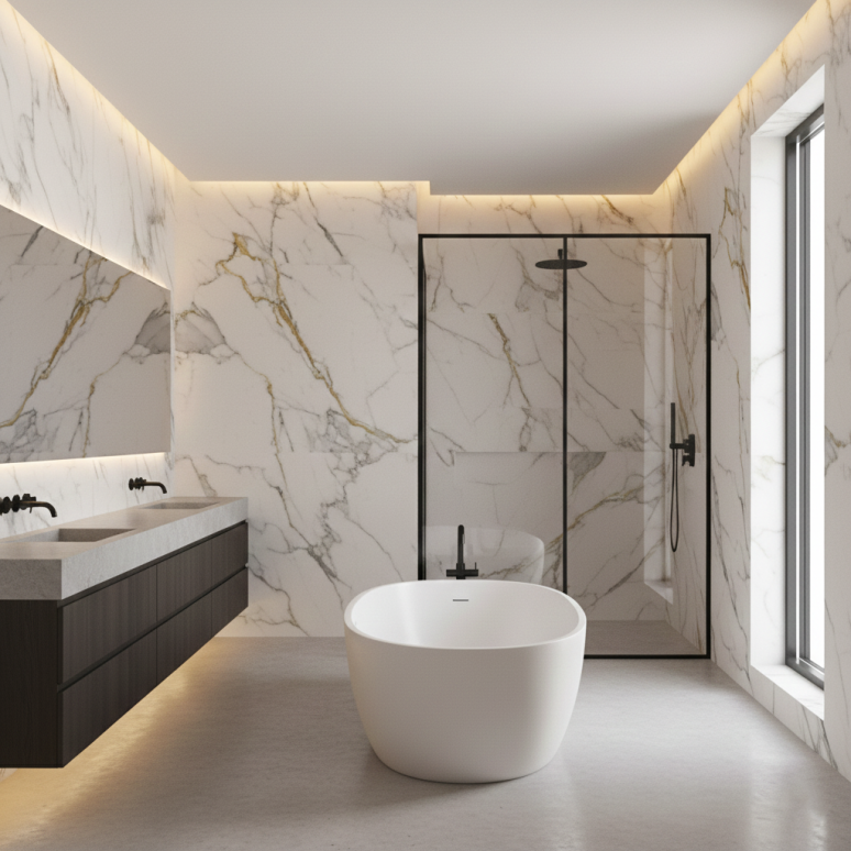 Voor wanden zijn marmer, graniet en dekton populaire keuzes. Deze steensoorten zijn niet alleen stijlvol, maar ook goed bestand tegen de vochtige omstandigheden in een badkamer.